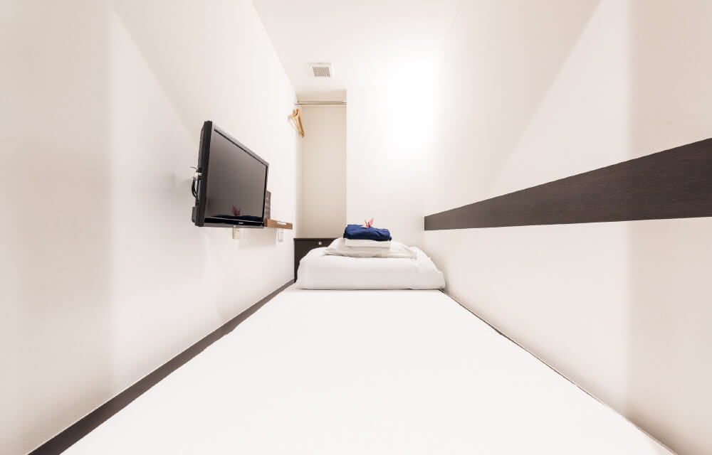 シングルベッドタイプの通路側ドミトリーです。全ベッドにテレビ、コンセント、照明、布団・枕、カーテン、衣類ハンガー、スリッパ、小物収納棚を備えており、Wi-Fiが無料で利用できます。ベッド下には鍵付きのトランクスペース、客室内にも鍵付き貴重品ボックスがございます。